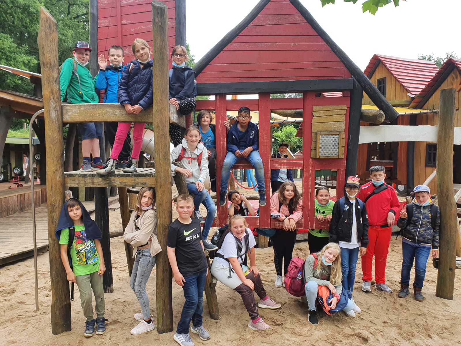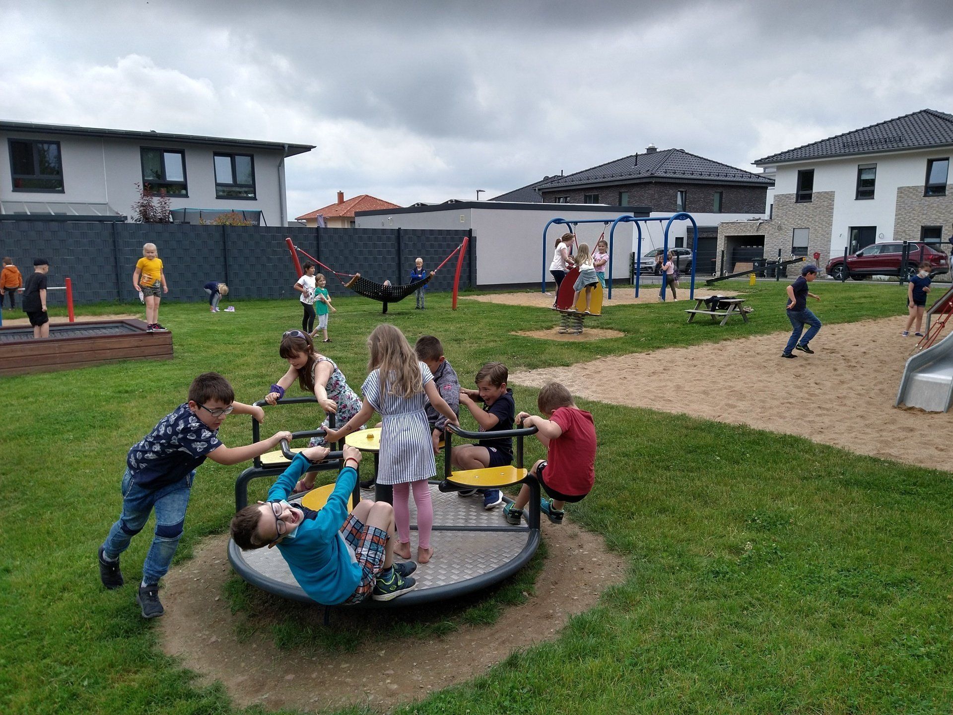 Die Klassen 1b und 1c haben gemeinsam einen Ausflug zum "nahgelegenen" Spielplatz unternommen. Das Wetter blieb trotz grauer Wolken trocken und die Kinder hatten viel Spaß! Zur Überraschung brachten zwei Mamas sogar noch eine kühle Erfrischung vorbei.