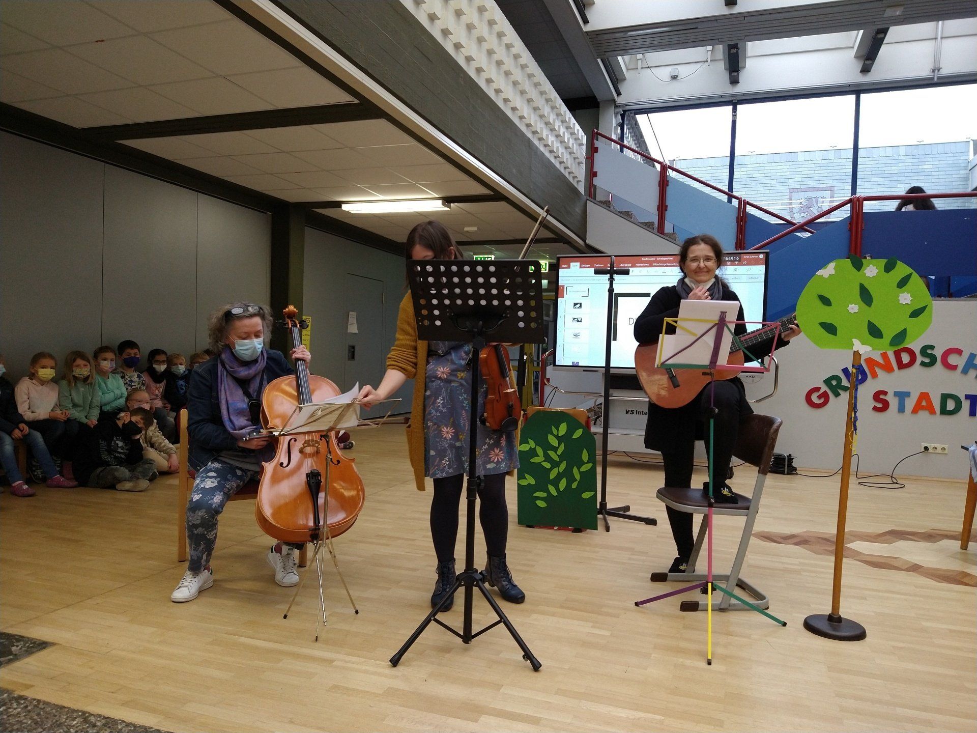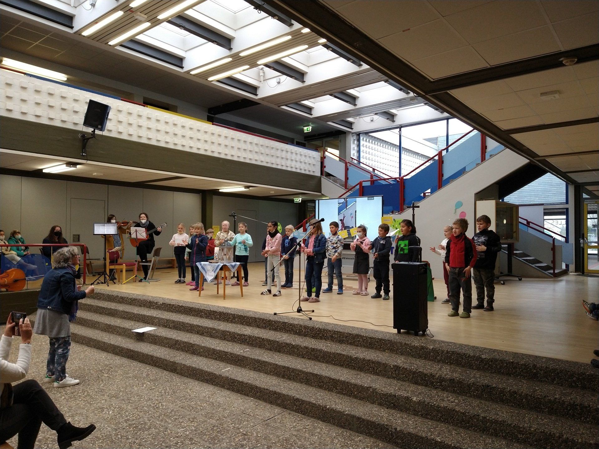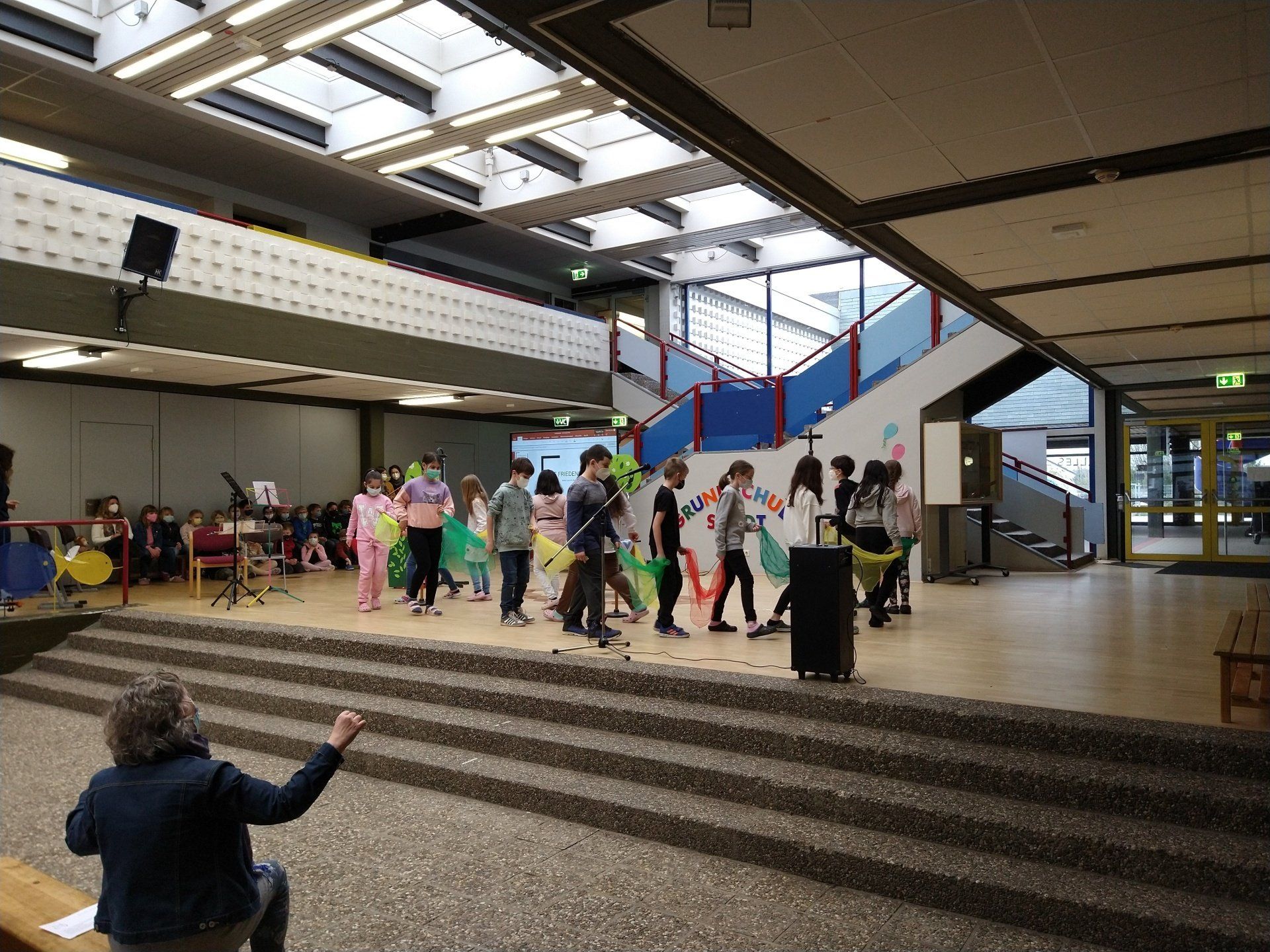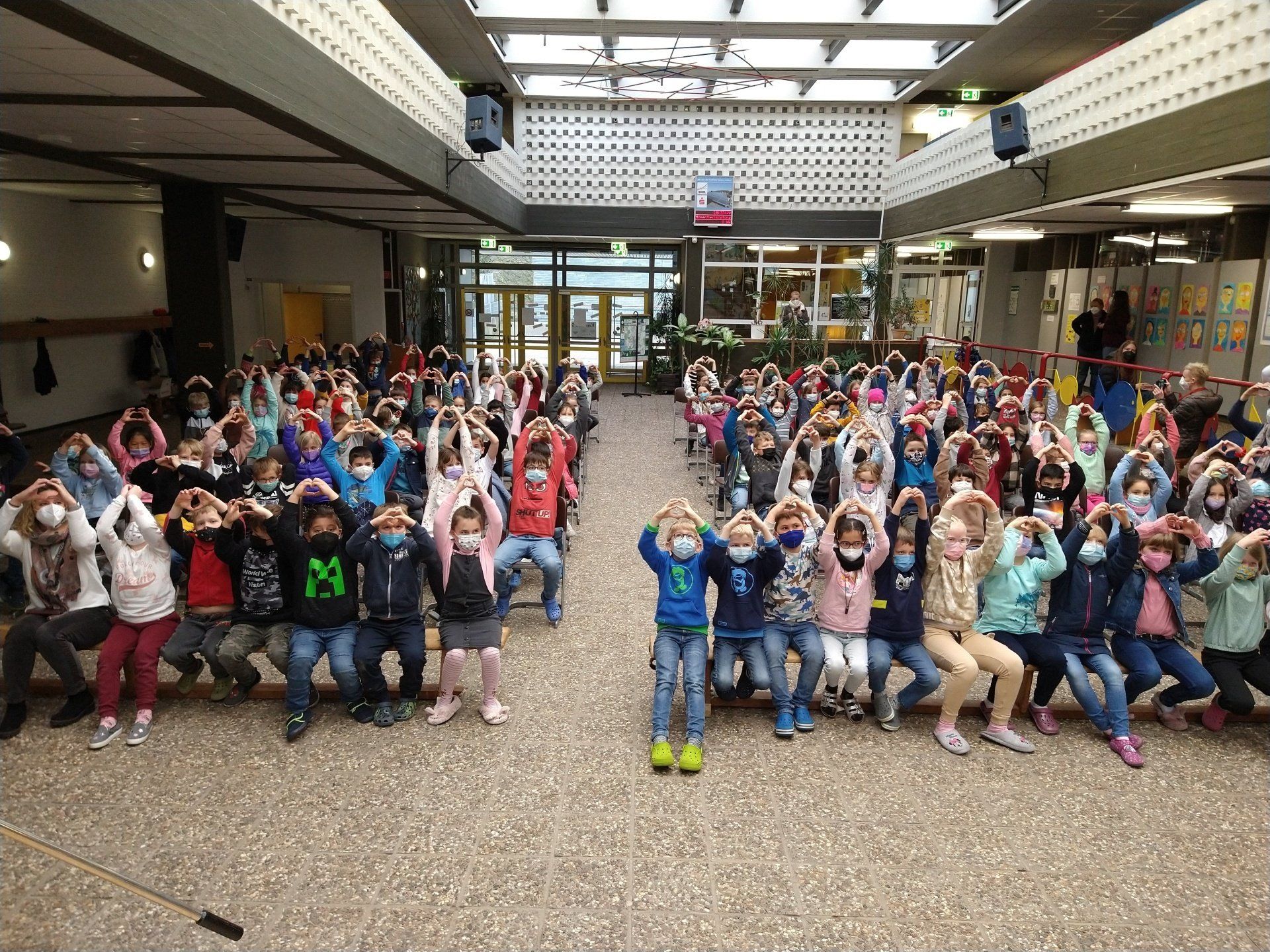 Auch die Kinder der GGS hatten eine Botschaft vorbereitet: Die Klasse 4b tanzte einen ukrainischen Volkstanz, Kinder aus unterschiedlichen Klassen riefen die Botschaft "Frieden" in den zahlreichen Sprachen ihrer Familien aus, die 4a stellte das Bild von Picasso "Kind mit Taube" ausdrucksstark in Fotografien dar und die 2c forderte mit ihrer Choreographie zu "Wir sind Kinder einer Welt" alle Anwesenden auf, die Botschaft mitzutragen.