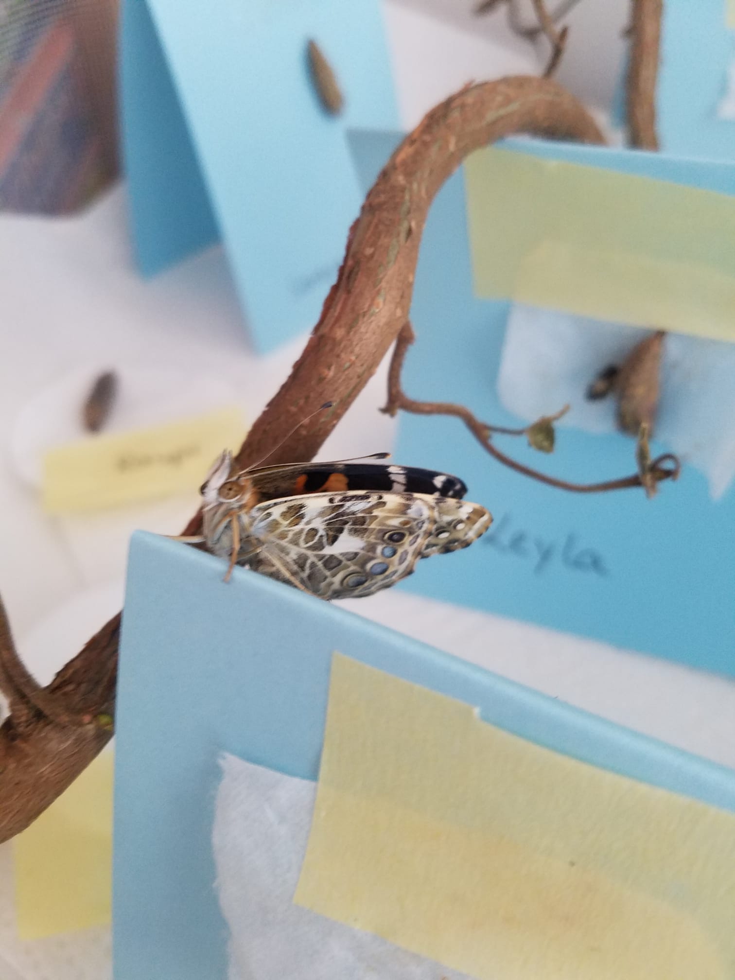 Zuvor haben die Kinder beobachtet, wie sich die Distelfalterraupe schön dick und rund als J aufhängte, um dann für ungefähr eine Woche verpuppt zu bleiben.