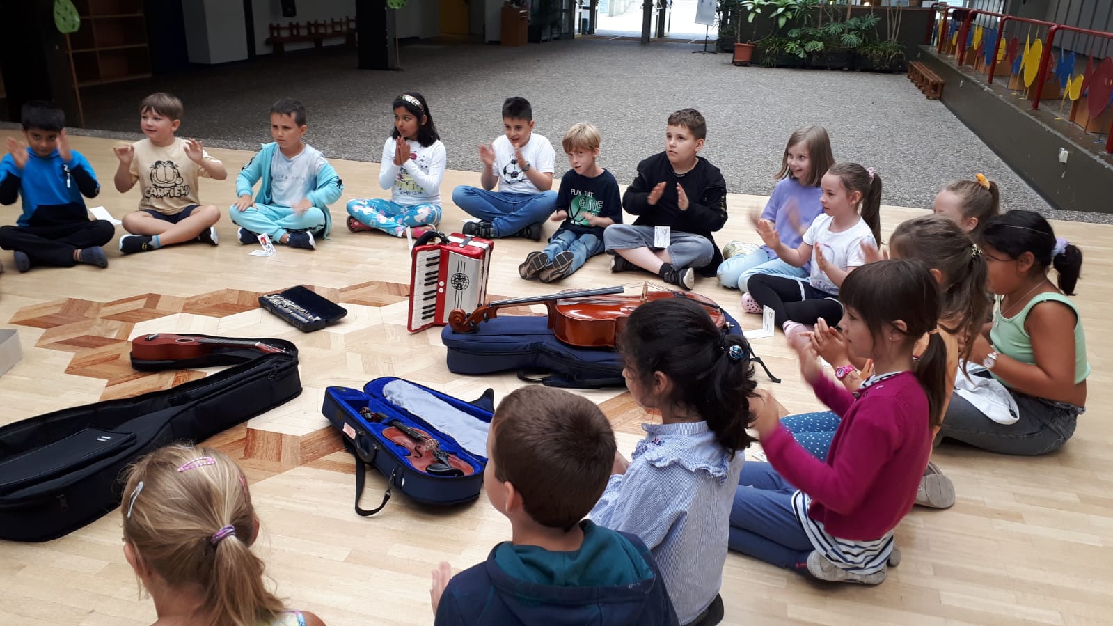 Heute war die Aula erfüllt von schöner Musik und viel Applaus. Alle Klassen waren eingeladen zu einem Konzert der Musikschule. Vier Lehrerinnen und Lehrer stellten ihre Streichinstrumente vor und spielten verschiedene klassische Stücke. Nach dem Konzert hatten die Kinder der 2. und 3. Klassen die Möglichkeit, die verschiedenen Instrumente auszuprobieren. Ein großes Dankeschön an die Musikschule für dieses besondere Erlebnis! Vielleicht haben ja manche Kinder jetzt Lust darauf, selbst Musik zu machen?
